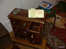 Na boku je postavená starodávna tajomná komoda s malými šuflíkmi. Na nej stojí veľká kniha, ktorá sa normálne volá misál a v nej sú napísané všetky modlitby, ktoré sa kňaz modlí počas bohoslužby obety. A aha: na opačnom konci komody je zvonček – ten dôverne deti poznajú zo zvonenia počas pozdvihovania. Dobre si asi pamätáš, že ešte sa používa jedna iná kniha, z ktorej sa čítajú čítania a evanjelium, tá sa volá lekcionár.