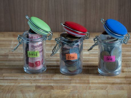 Vyčleňte tri poháre, na jeden nalepte štítok „šetrenie,“ na druhý „míňanie“ a na tretí „delenie.“ Zakaždým, keď príde od dedka, babky, krstnej s peniazmi, nech ich rovnako rozdelí do pohárov.