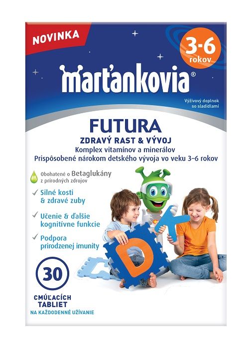 Vhodný produkt: Marťankovia FUTURA 3 – 6 cmúľanie tablety, výživový doplnok so sladidlami.